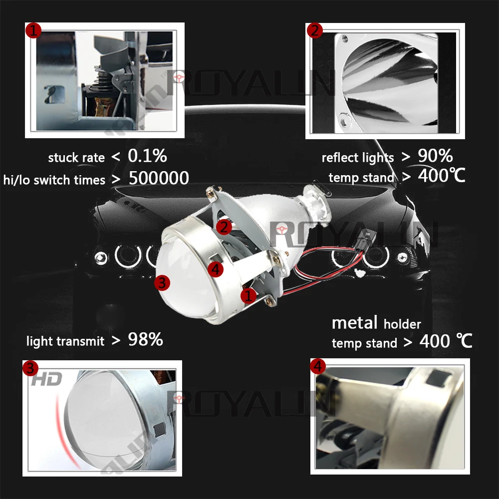 .image of ROYALIN Car-styling HID H1 Bi Xenon Headlight Projector Lens 3.0 Inch Full Metal LHD RHD for H4 H7